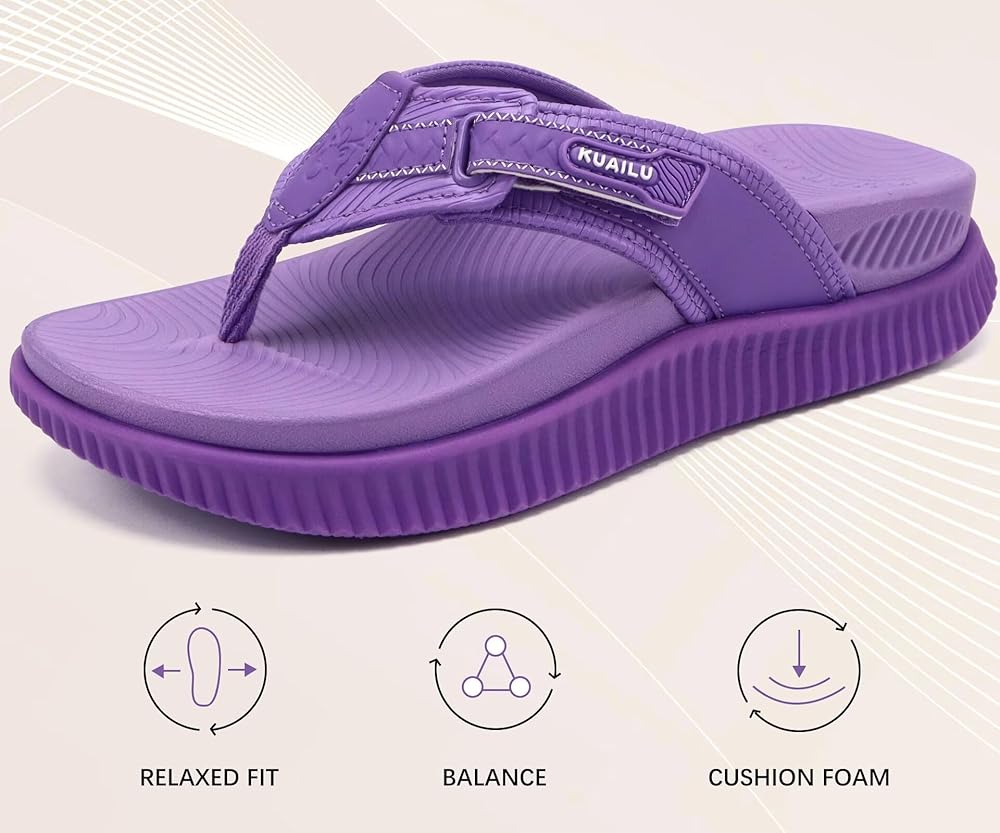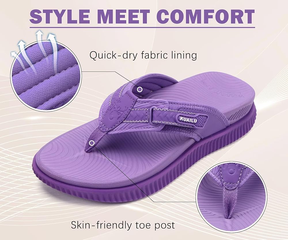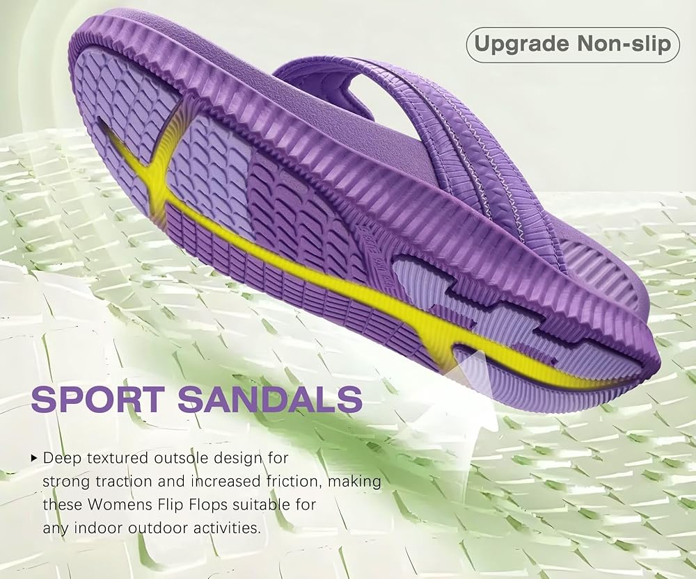 FASHION WOMENS FLIP FLOPS are sport and casual style. Womens Sandals open toe design keep your feet cool in summer. T-Strap is made of skin-friendly toe post and breathable fabric lining, easy to clean and quick-dry. Premium ortho arches thick cushion serve walking on cloud comfort.