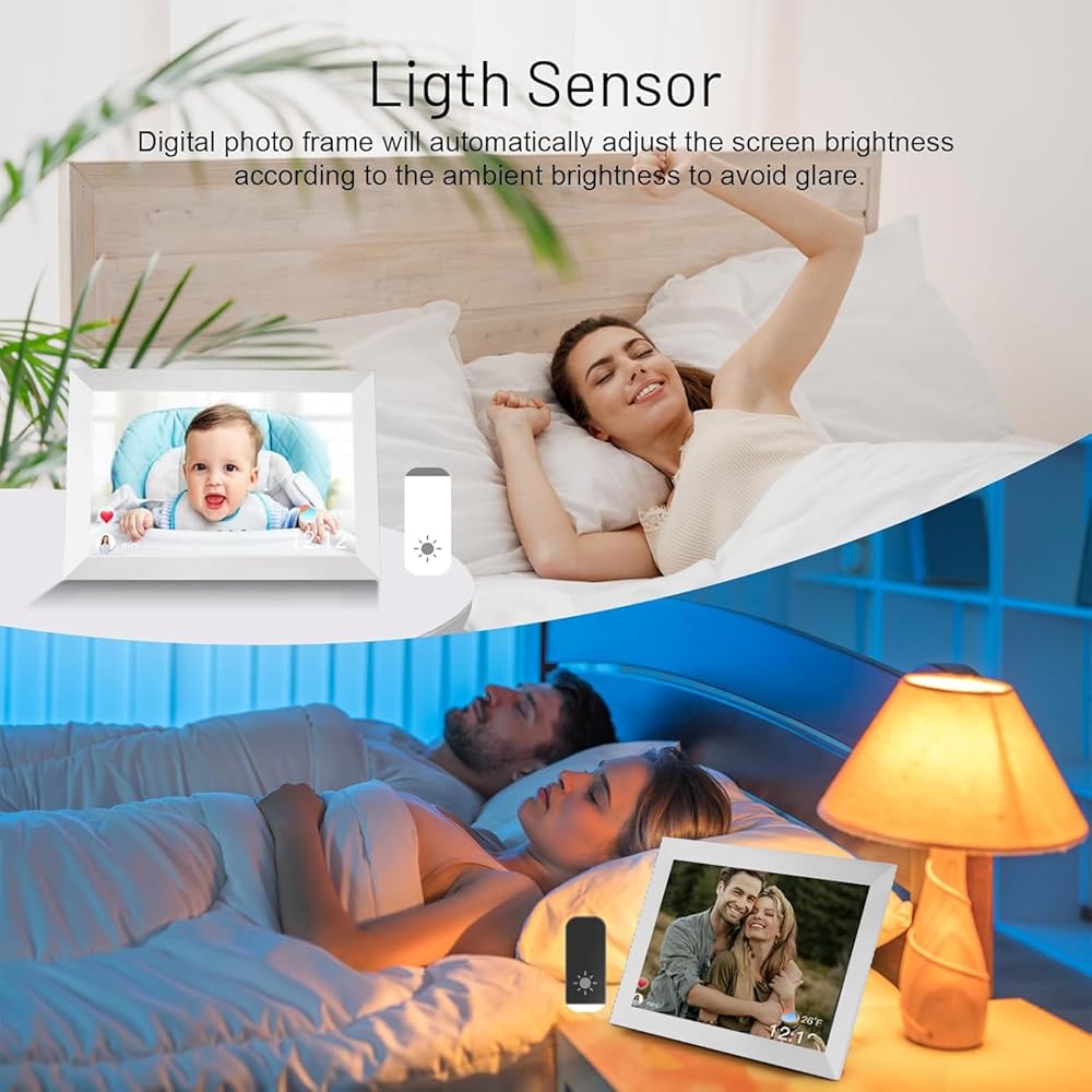 Newly upgraded 10.1 inch 1280*800 resolution high-definition touch screen shows crystal clear and vivid pictures, and provides more dynamic range and photo details, making your family/friends truly feel immersive. The IPS technology provide you with wider viewing angle and accurate color reproduction. Digital photo frame with a built-in light sensor can automatically adjusts the screen brightness according to the ambient light intensity.