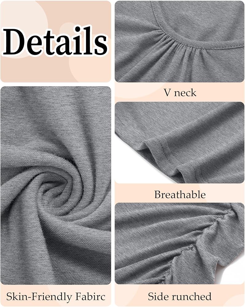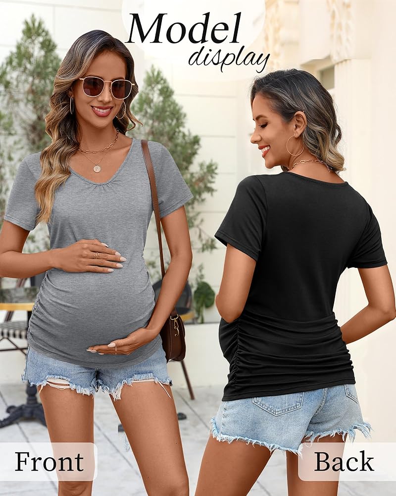 Flattering Look: the short sleeve maternity shirts feature a relaxed V neck design; Ruched at the sides, which can flexible to accommodate the changes of your belly, proper for showing off curves and protecting your body; Suitable for throughout pregnancy