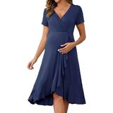 Elegant Design: Elevate your maternity wardrobe with our ruffle hem, wrap V-neck, midi length, and irregular hem maternity dress. This design adds an elegant touch to your pregnancy and postpartum style, providing a fashion-forward yet comfortable look for every look.