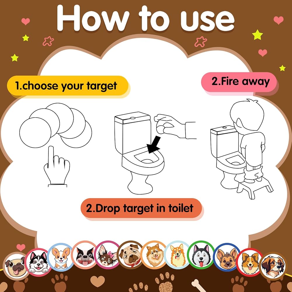 Easy to use: you can let your child learn how to pee, just throw potty training aids in the middle of your toilet and teach your child to aim at them, and targets will dissolve instantly, this not only trains your child to pee, but also makes him have fun; Note: it needs to be shot repeatedly at the target for it to dissolve