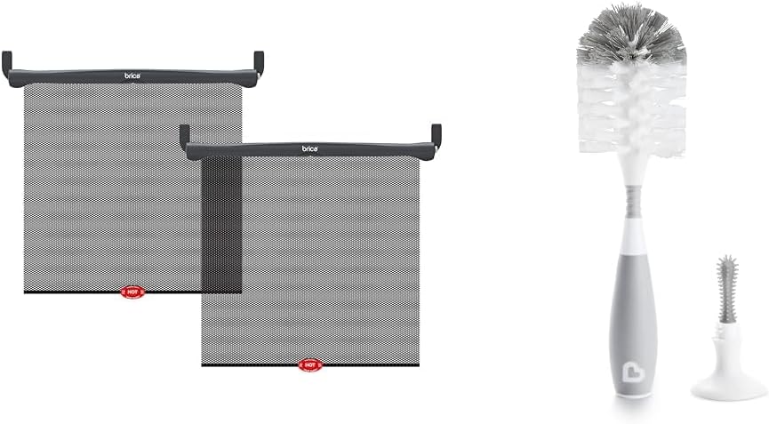 This convenient 2-pack bundle combines a retractable car window shade with a patented heat alert system and a pack of pacifier wipes for cleaning baby items. The Munchkin Brica car shades block sunlight and feature a White Hot heat alert that turns white when the car interior gets too hot, indicating when it's unsafe for children. The 2 universal-fit 15" x 19" shades attach via clips or suction cups for full coverage across rear side windows. An easy one-push retract button rolls up the shades into compact form. The see-through premium mesh material allows for visibility while protecting passengers. To keep baby's bottles, cups, pacifiers and teething toys clean, the bundle includes Munchkin's 36 Arm & Hammer pacifier wipes. The 4" x 6" wipes safely remove messes from baby gear without harsh chemicals or alcohol. Instead, they use a natural, food-grade formula perfect for delicate skin. Together, these car shade and cleaning accessories promote baby safety, health and comfort during travels.