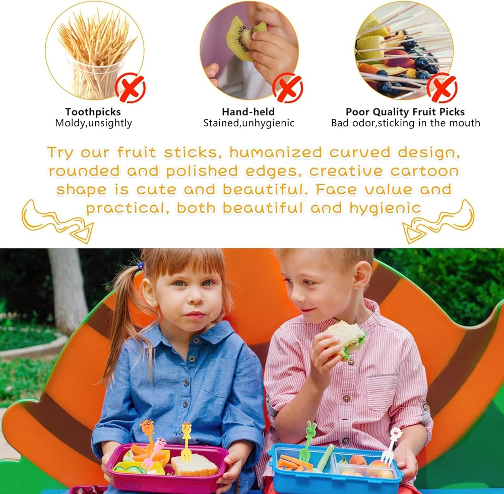 【Mini Fruit Forks Kids】Our fruit picks for kids lunch box have a size of 5.0 cm, a humanized curved design that makes it easier for children to hold the fork in their hands, rounded and polished edges, no bumps and ridges that will not scratch children's hands and mouths. Please note: To avoid accidental swallowing, children must be accompanied by an adult.