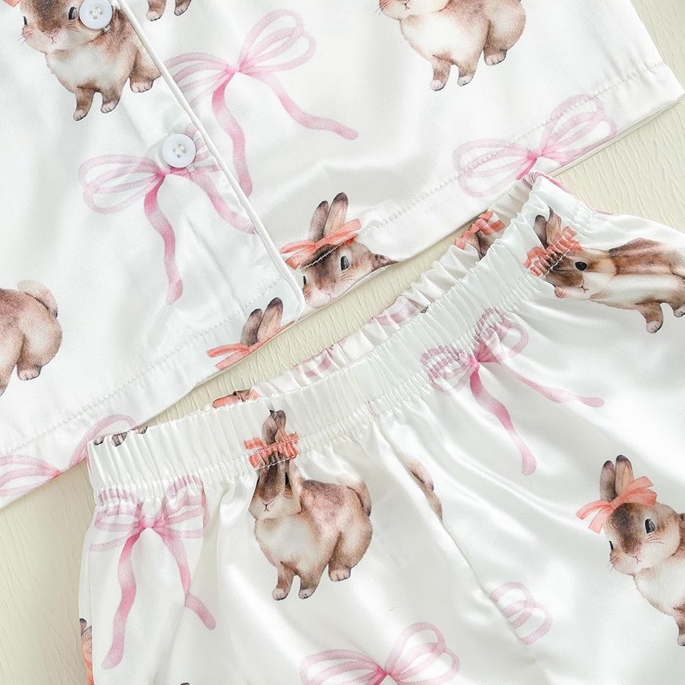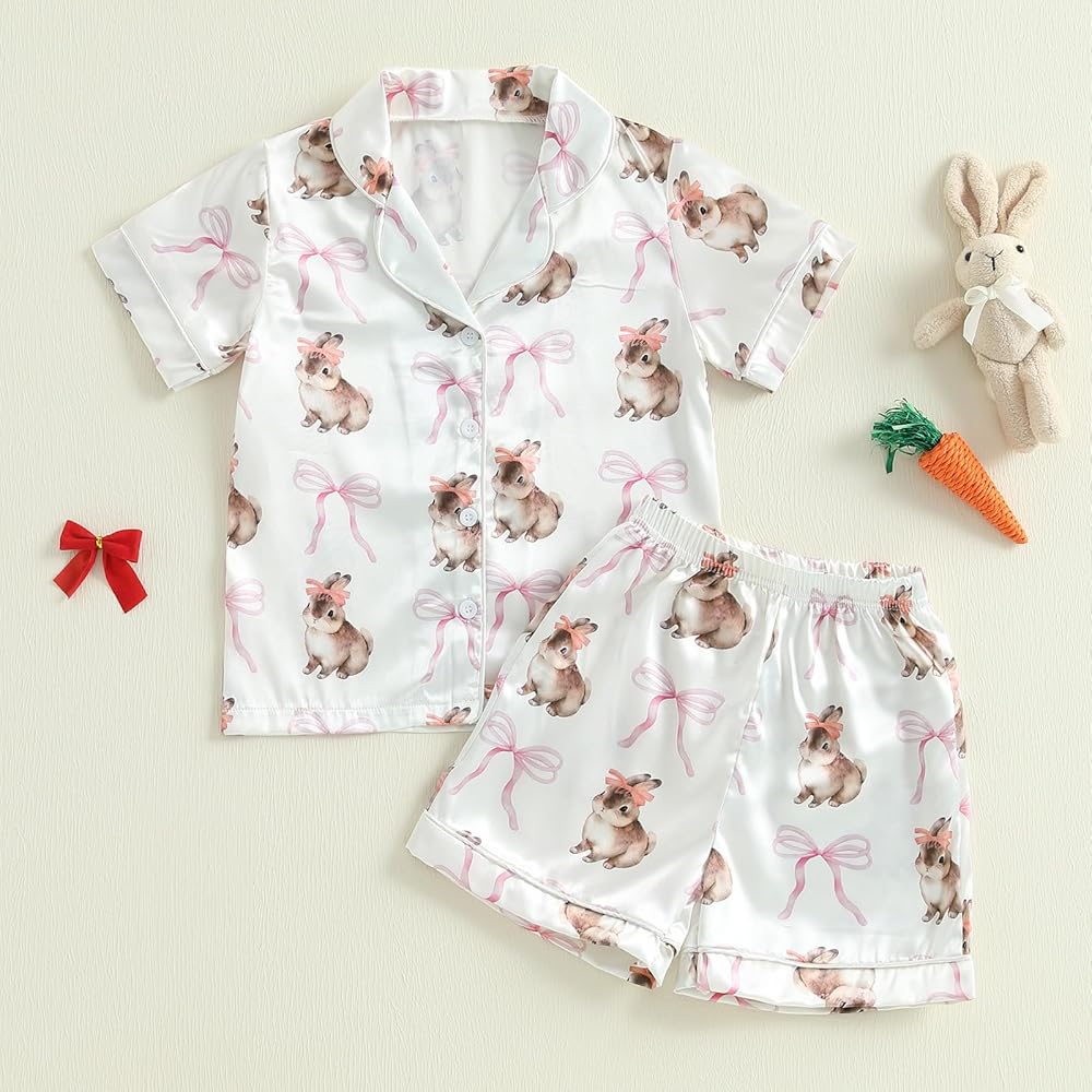 Girls Fourth of July Pajamas Set Short Sleeve Bow Print Button Down Shirts and Shorts Set Sleepwear