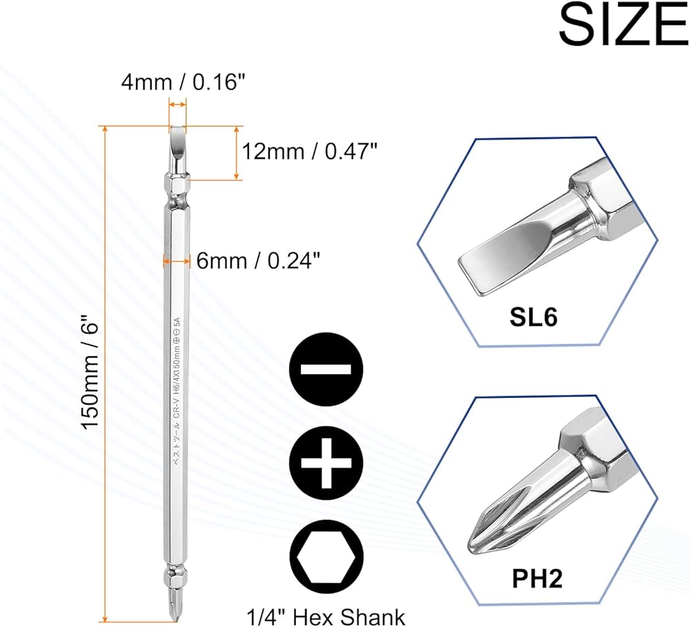 Size - PH2/SL6; Total Length: 150mm / 6"; Rod Dia.: 6mm / 0.24"; Bit Head Size: 12x4mm / 0.47"x0.16"(L*D); Phillips Slotted head drill bit specifically designed for driving screws into wood, metal, and other materials effortlessly. Can accurately tighten screws without damaging screws and screwdriver bits