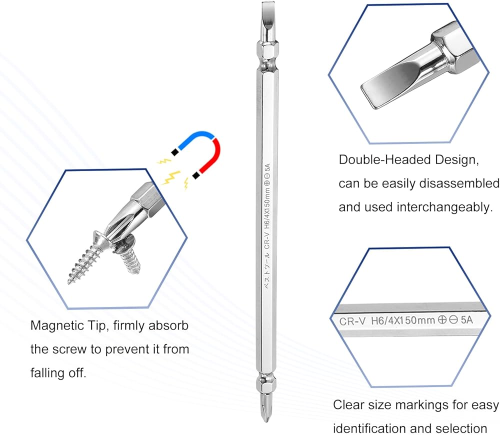 Feature - The two sided screwdriver bits are designed with strong magnetism, which can stably absorb the screws vertically or tilted and easily fix the screws, especially in a small space, which can make it more convenient to complete the work
