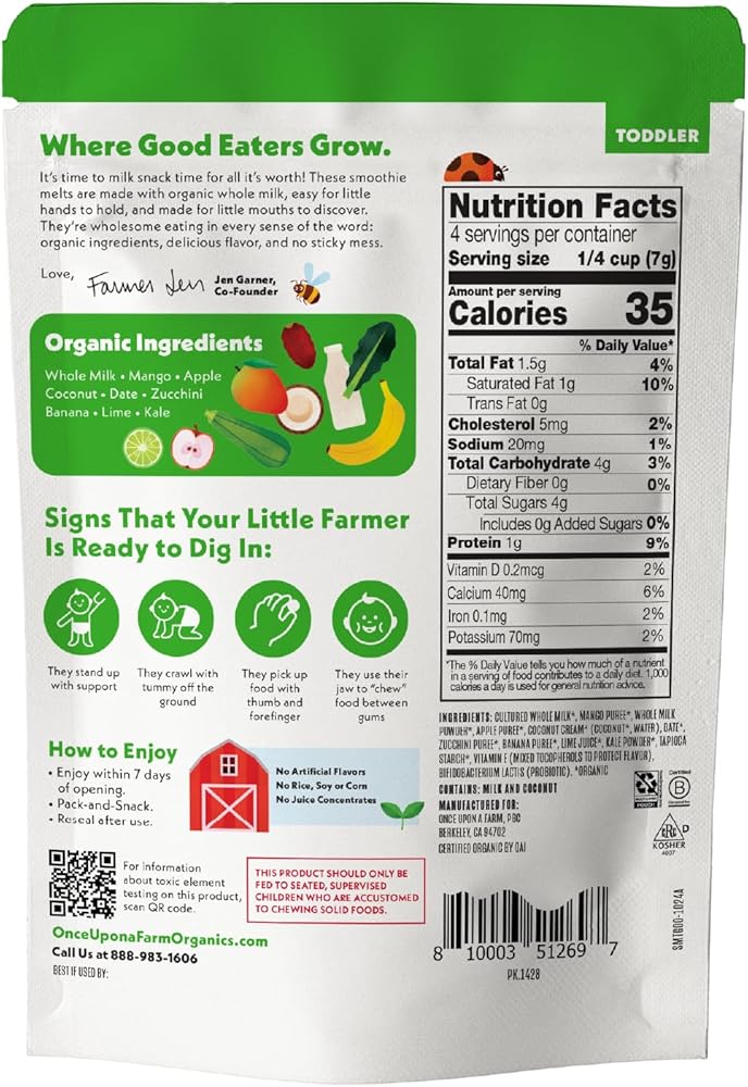 Smoothie melts for daring eaters: silky smooth, pincer-grasp-perfect, meltable bites made with organic whole milk that goes from light and crispy to rich and creamy faster than you can say, “Look at you eating all by yourself!”
