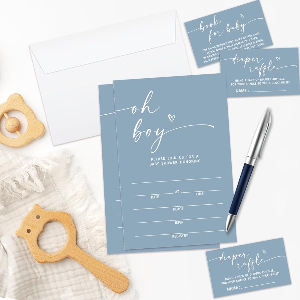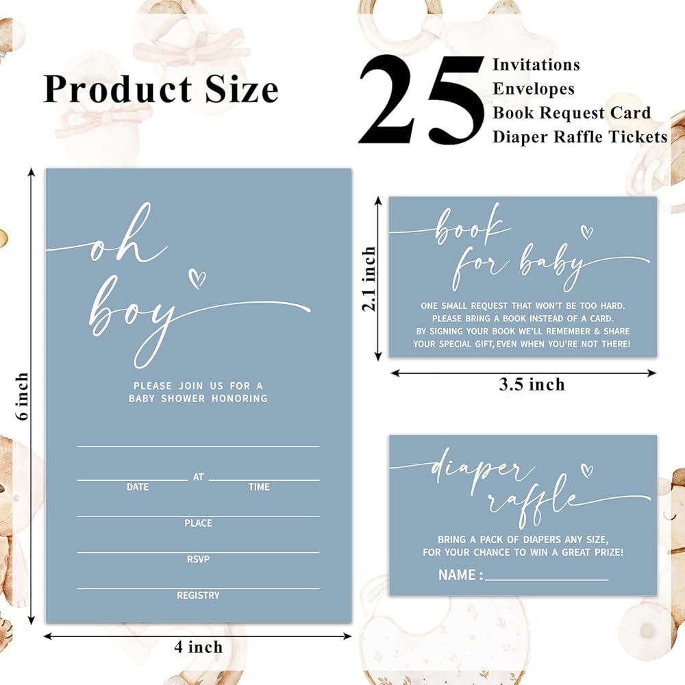 Quantity: A set of cards includes baby shower invitations, Book Request Card, Diaper Raffle Tickets and envelopes, each card is 25 pieces, enough for you to invite family and friends to the event.