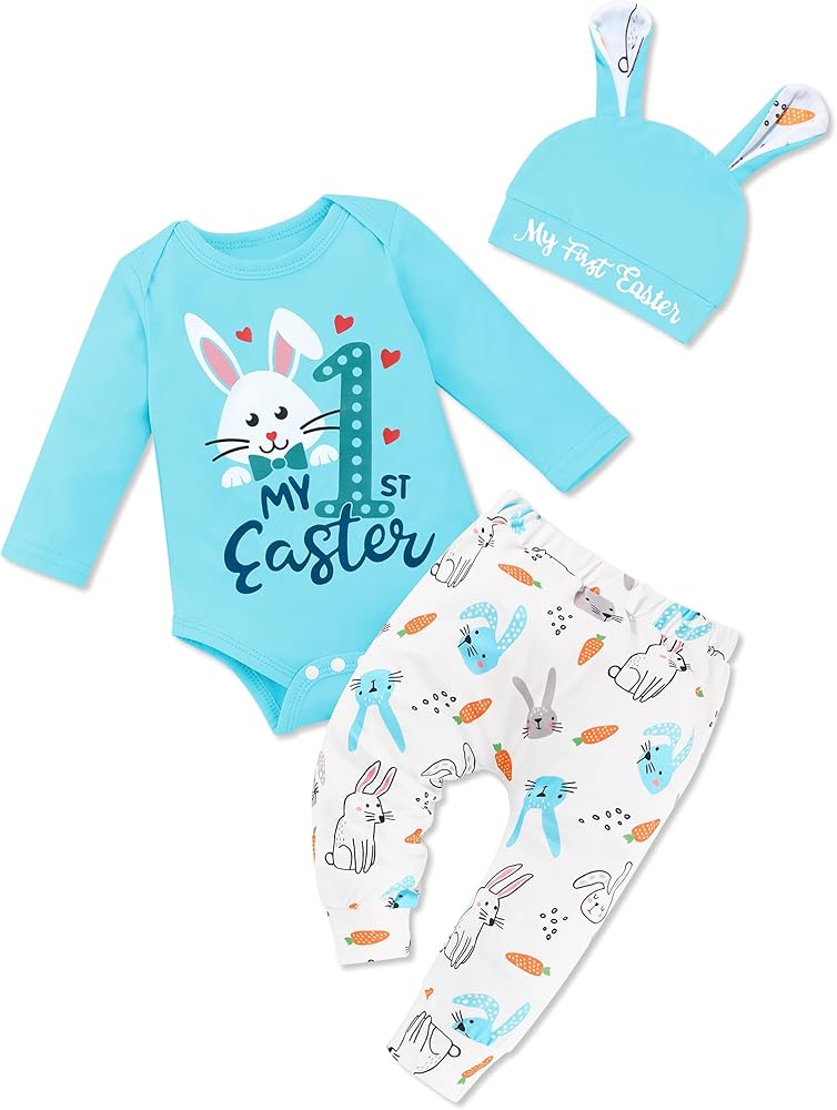 Design: This adorable easter outfit baby boy features a "My 1st Easter" romper, carrot-print pants with a comfy elastic waistband, and a cute bunny ears hat. The snap closure ensures quick diaper changes