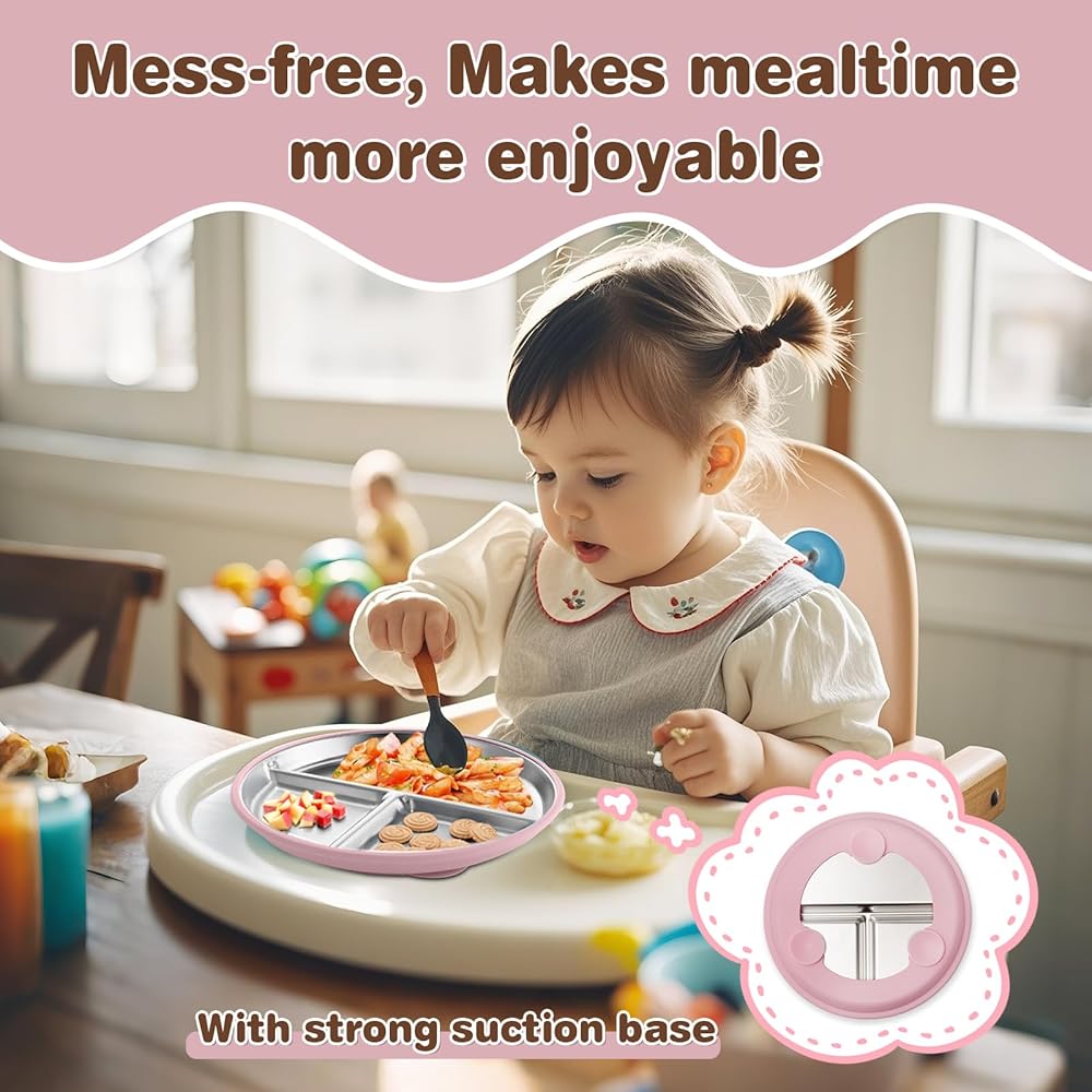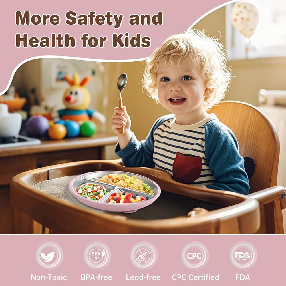 Easy to Clean & Convenient: The stainless steel surface is stain-resistant and easy to clean. Both the plate and removable silicone suction base are dishwasher-safe, ensuring quick and easy cleanup for busy parents. Stackable for easy storage, making it perfect for on-the-go use