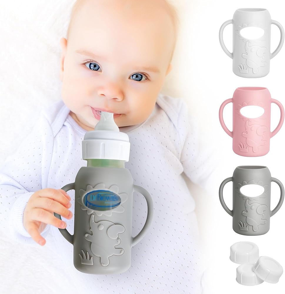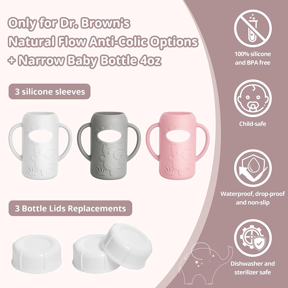 Package Included: Each set includes 1 white, 1 pink, 1 grey silicone bottle sleeves, and 3 bottle caps. Compatible with dishwashers and sterilizers, these high-quality silicone materials guarantee durability for long-term use. Only suitable for Dr Brown Natural Narrow Glass Baby Bottle 4 oz