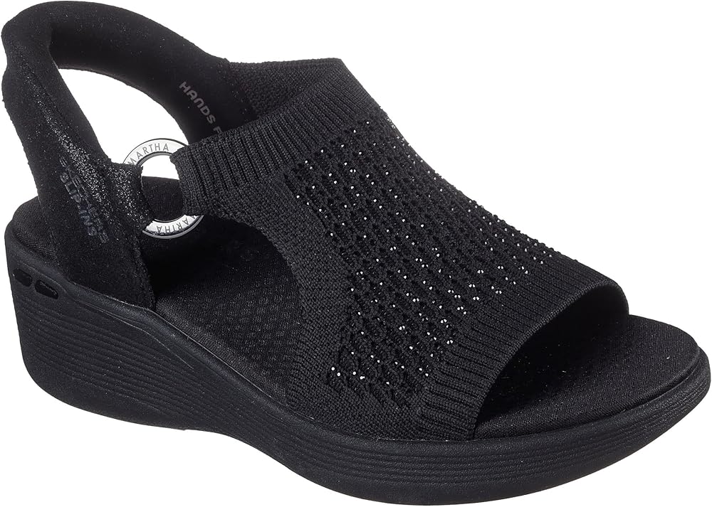 Celebrated lifestyle expert, Martha Stewart, delivers her one-of-a-kind touch to Skechers in this spirited collaboration. Shine on in easy-wearing flair with Skechers Hands Free Slip-ins® x Martha Stewart: Pier-Lite - Park Path. This slip-on fashion wedge sandal features a rhinestone knit upper with branded O-loop detail, a Luxe Foam® cushioned footbed, wedge midsole, and a hands-free Skechers Slip-ins® backstrap.