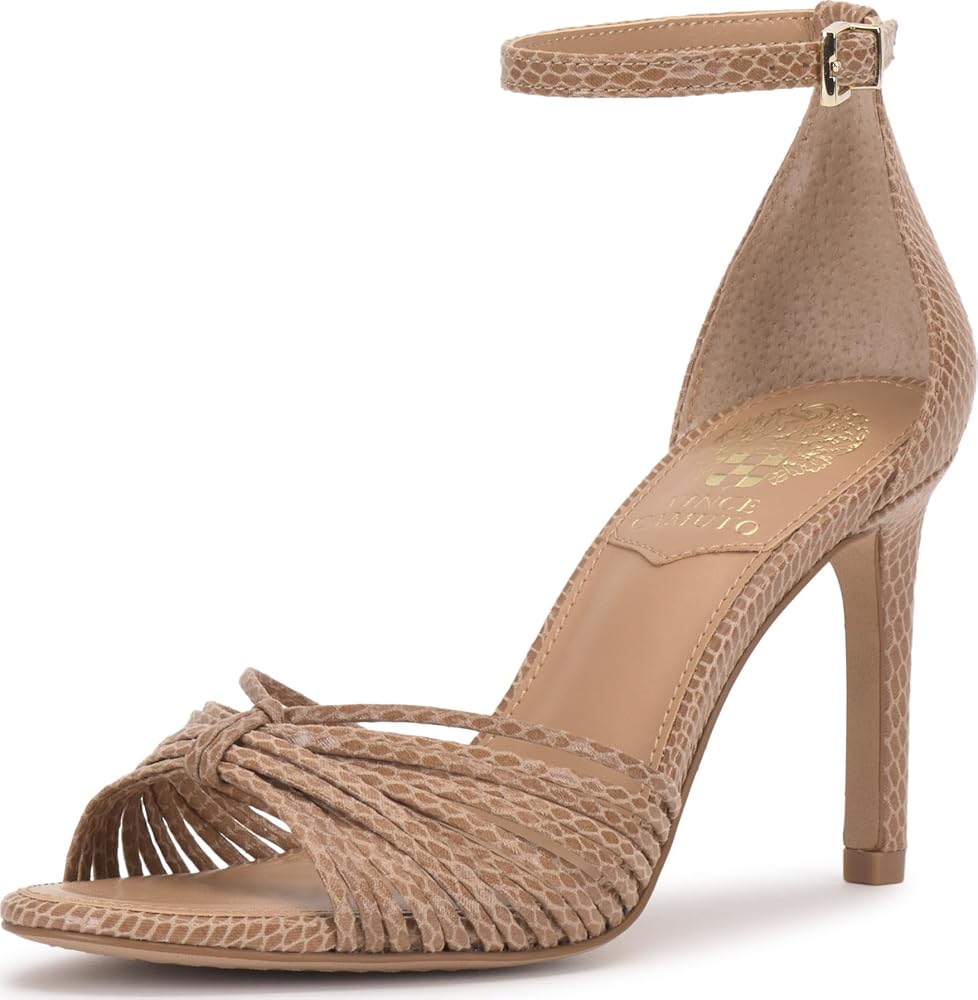Step into sophistication with this high-heel open-toe dress sandal. Featuring a closed back and adjustable ankle strap for a secure fit, this sandal is both stylish and comfortable. The covered stiletto heel and strappy upper are complemented by a chic knotted detail at the toe, adding a touch of elegance. Available in classic black and white, soft spring hues, or a hint of metallic, this versatile sandal is the perfect complement to your Girls' Night Out ensemble or a refined wedding guest look.