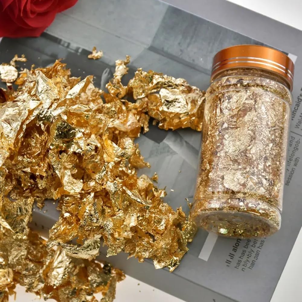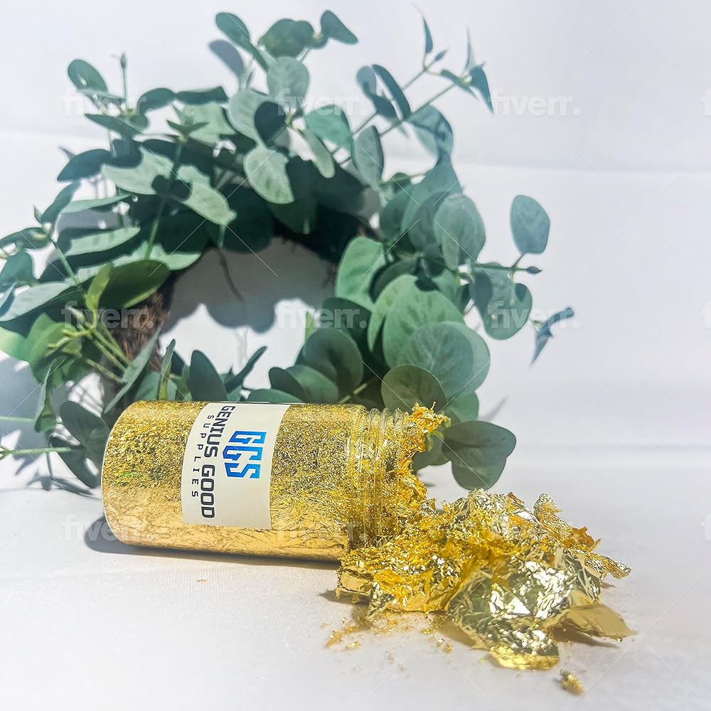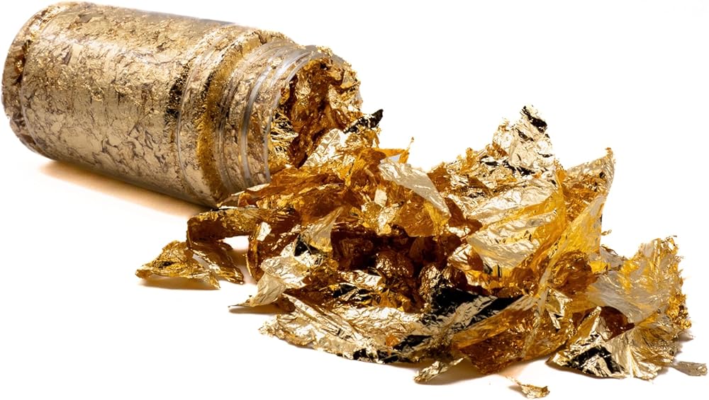 Introducing our Gold Leaf Flakes - the perfect way to infuse your art and decorating projects with a touch of luxury and sparkle. These high-quality gold-leaf flakes are your ticket to creating stunning and refined masterpieces that captivate the eyes and imagination. Crafted from premium quality, authentic gold leaf, each delicate flake is meticulously made to deliver an exceptional level of brilliance and shine. Elevate your creative endeavors with a flawless look that exudes sophistication. Applying our Gold Leaf Flakes is a breeze. Just spread the leaves on your desired surface and let them gracefully adhere [gloves and small tweezers recommended]. For long-lasting adhesion, you can opt for special adhesives [NOT INCLUDED] to ensure your creations stand the test of time. Experience amazing results without the fuss. Embrace elegance like never before with our Gold Leaf Flakes. Whether you're highlighting intricate details in a painting or adding golden touches to a sculpture, our flakes will effortlessly lend an air of refinement to your projects. Why wait to add a golden glow to your creative visions? Click "Add to Cart" now and watch your ideas come to life with a touch of opulence and style. Unleash your creativity and transform ordinary projects into extraordinary works of art with our exquisite Gold Leaf Flakes.