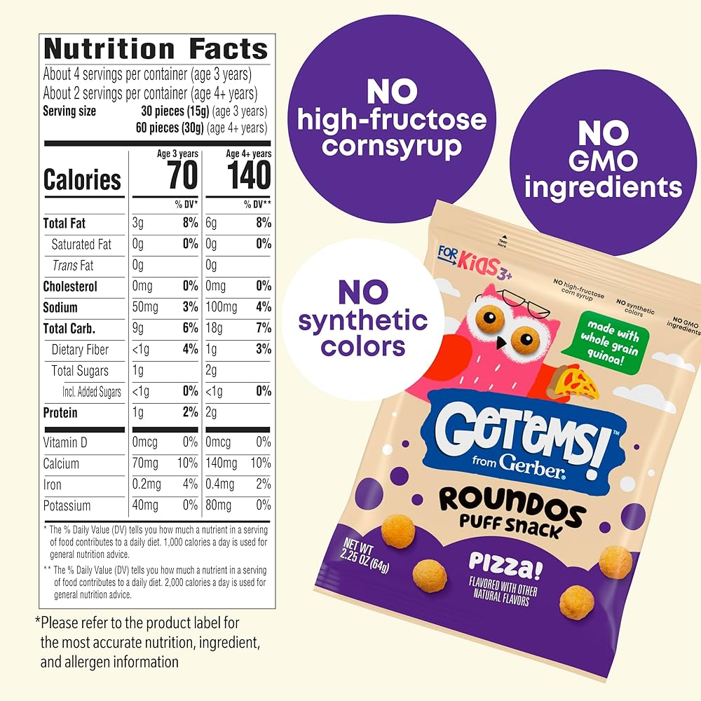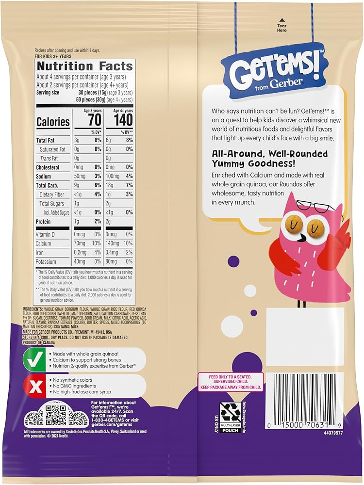 ALL AROUND, WELL-ROUNDED YUMMY GOODNESS: Enriched with calcium and made with real whole grain quinoa, our Get'ems! from Gerber Apple Cinnamon Roundos Puffs Snacks offer wholesome, tasty nutrition in every munch
