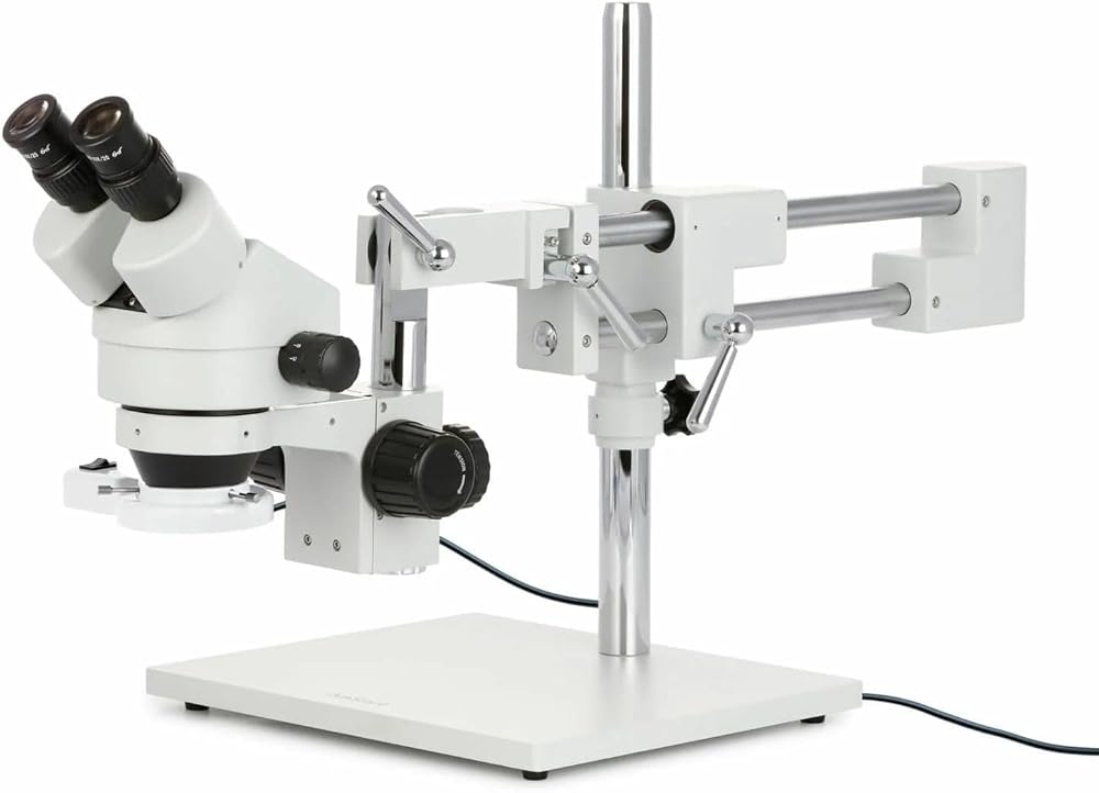 The AmScope SM-4BX-FRL professional stereo zoom microscope has a pair of 10x super-widefield high-eyepoint eyepieces, a 0.7x-4.5x zoom objective, a 0.5x Barlow lens, and a double-arm boom stand. The microscope has an overall magnification range of 3.5x-45x. The binocular viewing head has an interpupillary range of 55 to 75mm, a 45-degree inclination to reduce eye and neck strain, and 360-degree rotation to enable sharing. The WH10x20mm super-widefield high-eyepoint eyepieces combine with the 0.7x-4.5x zoom objective to provide continuous zoom magnification and a longer working distance for inspecting large-scale specimens that require handling or repair. The microscope comes with a 0.5x Barlow lens that can be added to the objective to decrease the magnification range. A Barlow lens with a magnification of less than 1.0 reduces magnification and increases the working distance. High-eyepoint eyepieces ease viewing for users who wear glasses, and dioptric adjustment accommodates individual eye-strength differences. A stereo microscope, sometimes called an inspection or dissection microscope, has low magnification and a long working distance that enables users to manipulate the object being inspected.