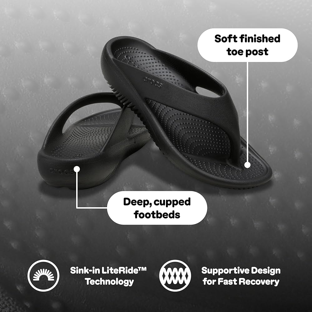 End your day in ultimate comfort with the Crocs Mellow Recovery Women's Flip Flop, the best arch support sandals for women. These flip flops for women are designed to cradle your feet with deep, cupped footbeds for a soothing sink-in feel. The slow rebound offers unparalleled relief, making these the best flip flops for walking and perfect for women with high arches. Featuring an EVA upper and a soft-finished toe post, these orthopedic shoes women sandals ensure a roomy fit for maximum comfort. The LiteRide foam provides revolutionary softness, turning every step into a gentle embrace, ideal for leisurely strolls around the house or casual outings. The slight wedge design enhances comfort and support, positioning these women's high arch sandals as a go-to for relaxation after a long day. Built with an EVA outsole for durability, these flip flops for women bulk purchases are not only long-lasting but also stylish. Whether you're lounging at home or running errands, these women's sandals with arch support are your perfect companion for both style and functionality. The contemporary design ensures that while you enjoy comfort, you also maintain a modern look. Suitable for various occasions, these flip flops arch support will meet your needs for both comfort and aesthetics.