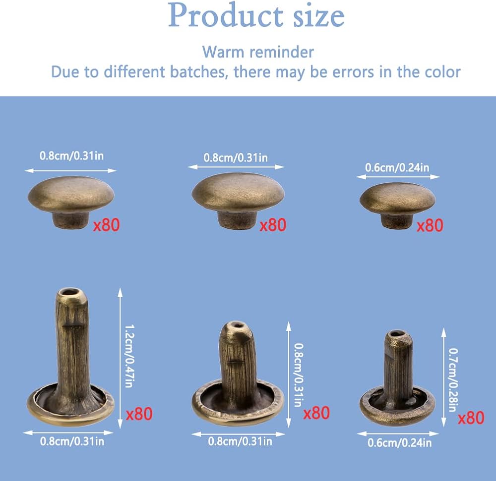 3 Different Sizes: 240 Sets double cap rivets with 3 sizes of 80 sets each, 3 different sizes: 6*6 mm (0.24*0.24in), 8*8 mm (0.31*0.31in), 8*12 mm (0.31* 0.47in), for leather and crafts of various thicknesses.