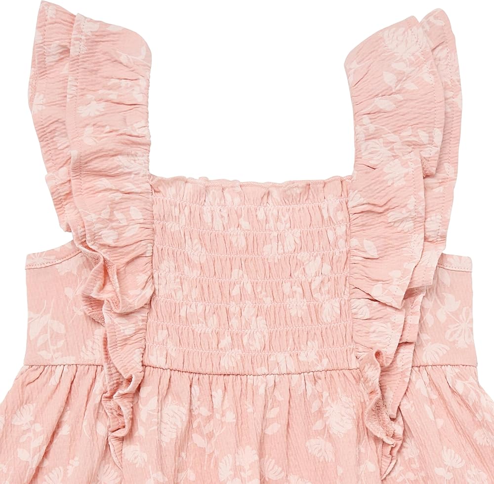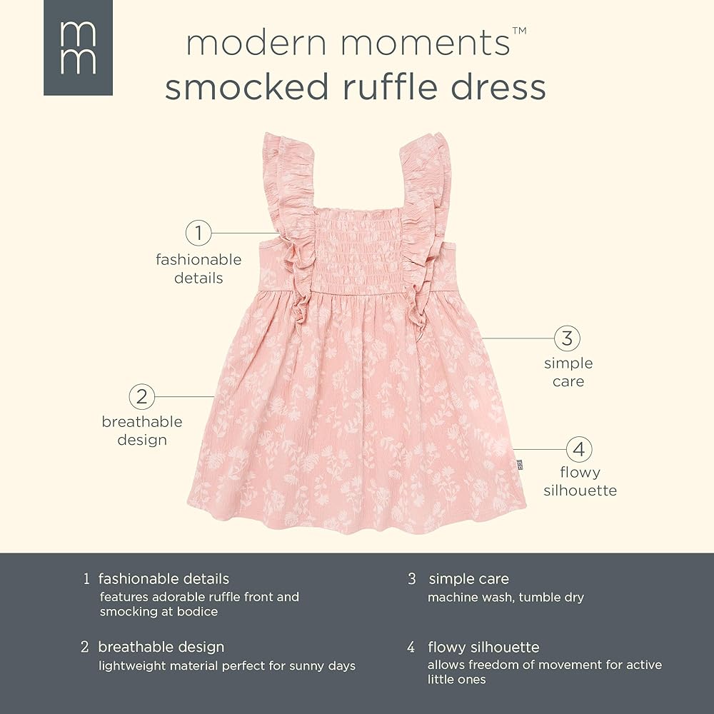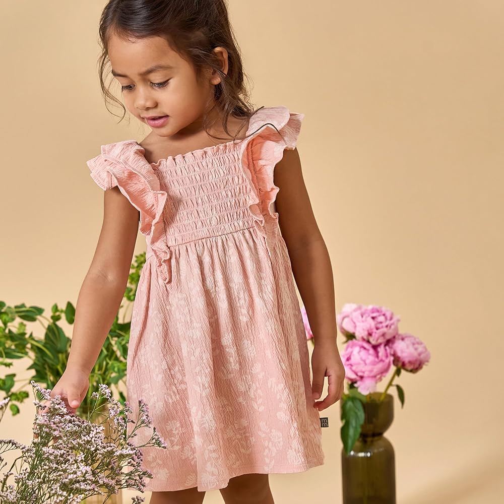Your baby girl or toddler girl will look adorable and feel comfortable in this fun and fashionable dress! Made from soft fabric with a natural stretch, this dress is designed for flexibility during play. The smocked bodice adds a stretchy, snug fit, while the ruffled shoulders and charming flower print create a picture-perfect look. Whether it's for a family photo or a day of exploring, this stylish dress is sure to make her stand out!