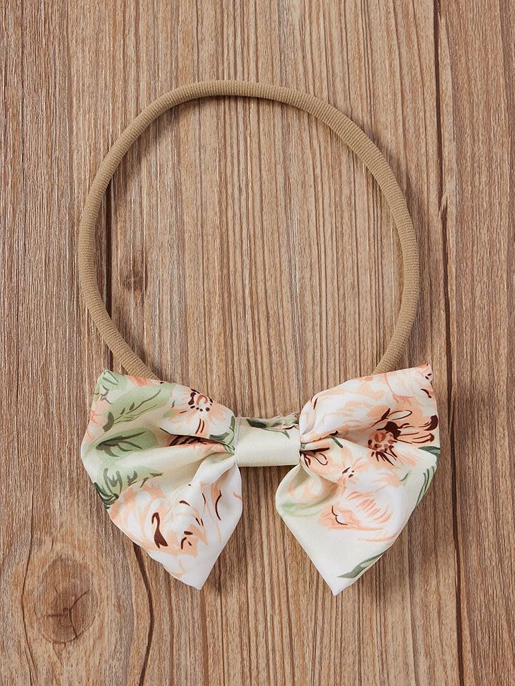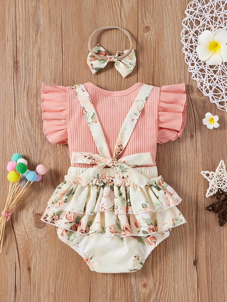 Design: The top is a solid color fly-sleeve round neck design, the trousers are floral print overalls, and the same bow headdress is matched. The fashionable shape makes the baby vibrant and cute