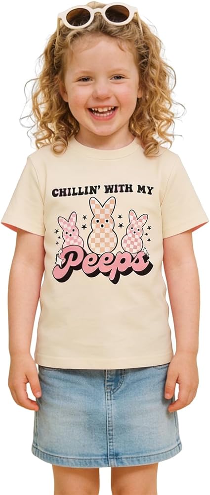 🐰Design: Super cute checkerboard bunny graphic shirts for Easter, baby girl "chillin' with my peeps" graphic crewneck t-shirt, toddler girls happy Easter party clothes, little girls Easter holiday pullover tops, big girls bunny letter print short sleeve shirt. The lovely girl's checkerboard rabbit graphic t-shirt will be a wonderful Easter party bunny outfit top!