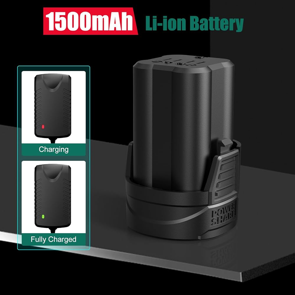 CHARGE ONCE, USE FOR MONTHS: A li-ion battery is lighter and smaller than a NiCd battery of the same voltage. Li-ion batteries can hold a charge for several months between uses. 1.5Ah lithium,complemented by a convenient 2-color battery indicator light,making the power level clear at a glance.Suitable for home use, capable of sustaining long work periods,ensuring your projects are completed smoothly.
