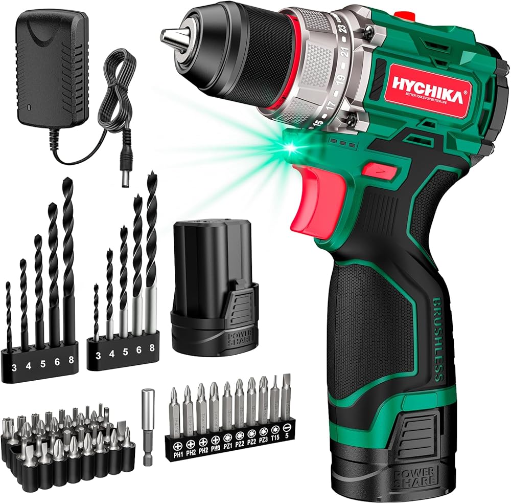 TRUE BRUSHLESS MOTOR,MORE EFFECTIVE, 3X SERVICE TIME, LOWER NOISE: HYCHIKA brushless drills improve work efficiency by 100% and prolong machine life by 300%. Brushless motors reduce friction and heat during use, consuming less energy, greatly reduce the noise and loss of the electric drill. Perfect for home use.