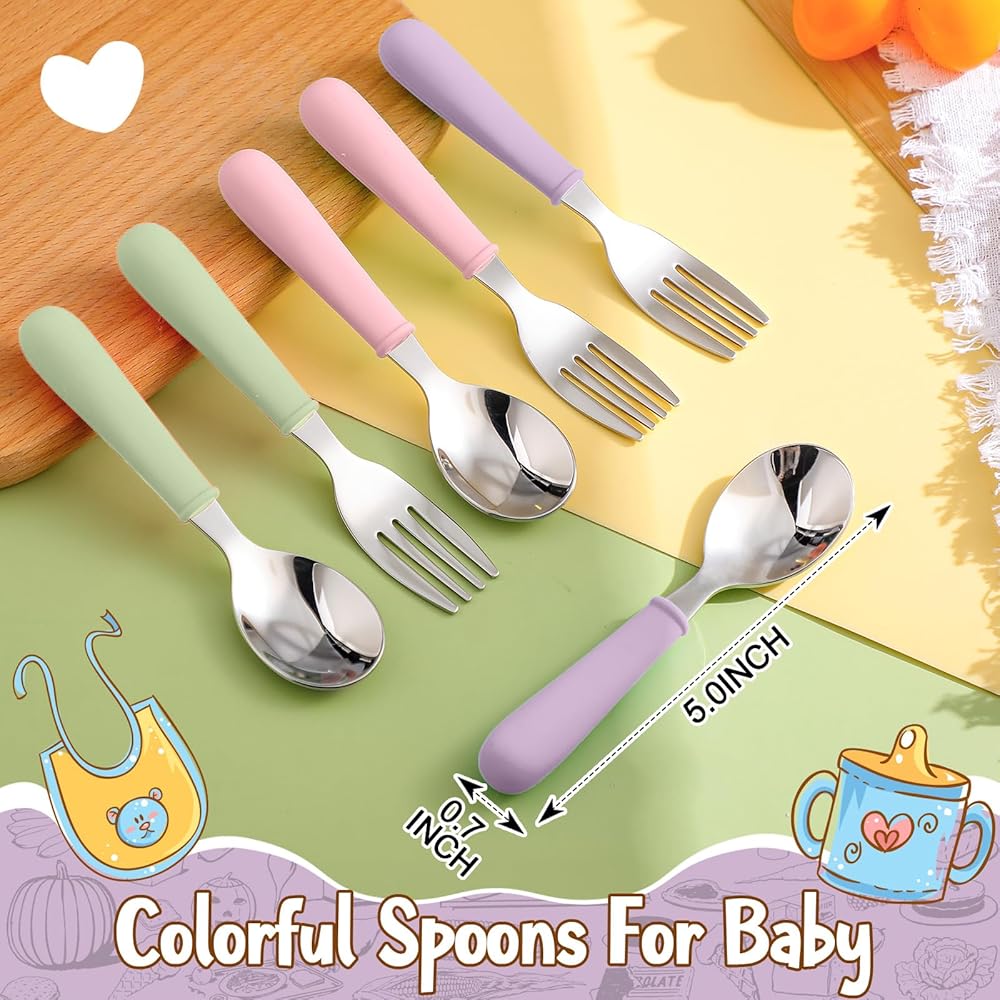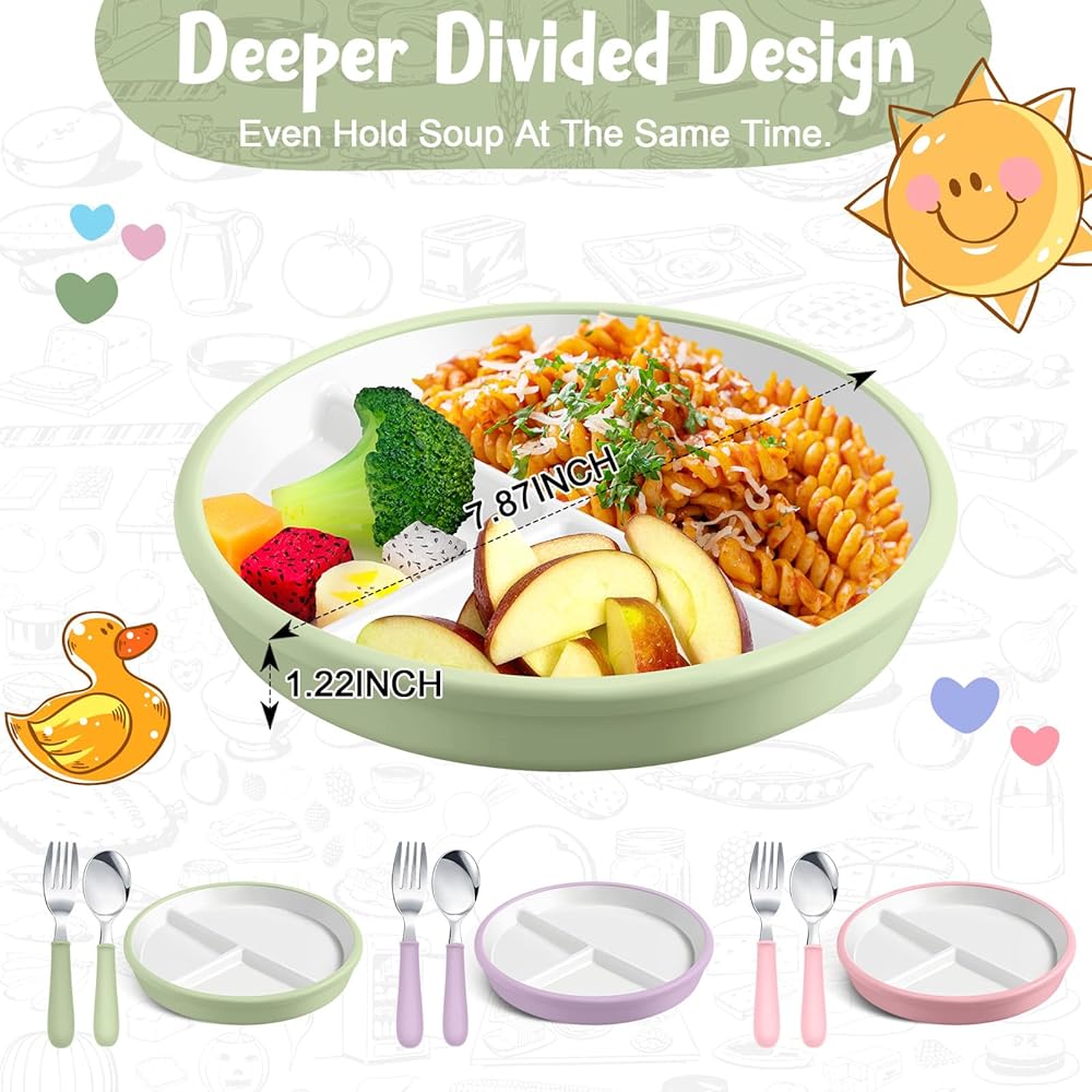 Toddler Cutlery Set: each set of toddler utensils includes 3 kids plates, about 8 x 8 x 1 inch; 3 silicone protective covers in 3 colors, blue, green, beige; 3 forks and 3 spoons, about 4.92 inch, designed for toddlers learning to self feed; After receiving the product you need to carefully move the bottom of the silicone suction cup to separate our toddler plates