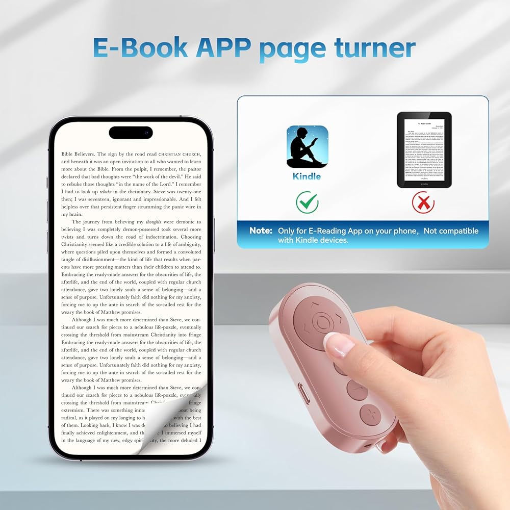 【E-Book App Page Turner】This wireless remote can help you control the page-turning of the E-book APP, and enjoy a comfortable reading experience. 【Note: ONLY available for e-book APP on Smartphone, not work for Kindle devices or any E-reader device.