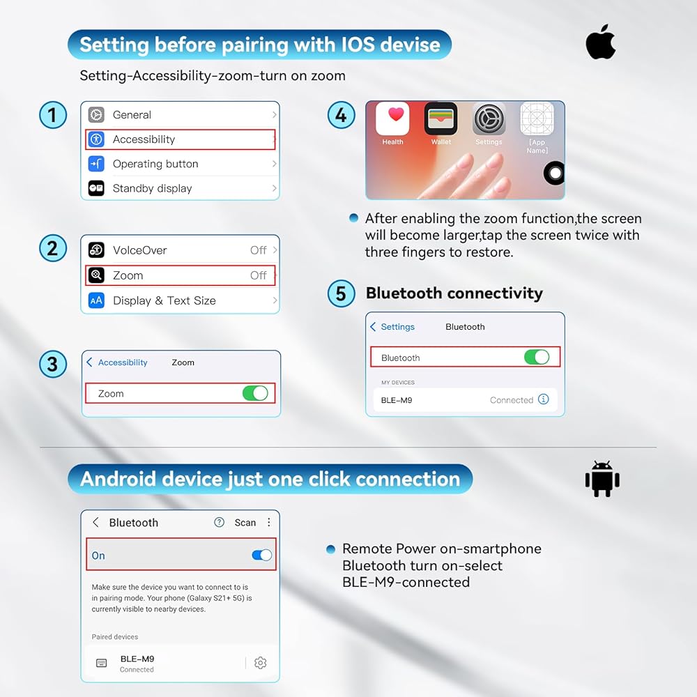 【Wireless Remote Control for short video】you can use the Bluetooth Scrolling Remote Control to Swipe the next/previous video, give a like, Volume +/-, left and right Swipe. Hands-free Operation with this Bluetooth remote control. iOS devices Settings: Open setting>Accessibility>Zoom>Turn on Zoom>Using three finger twice click the screen to restore, then you can connect the remote via Bluetooth Note:Only for Tiktok, not work well with other short video APPS.