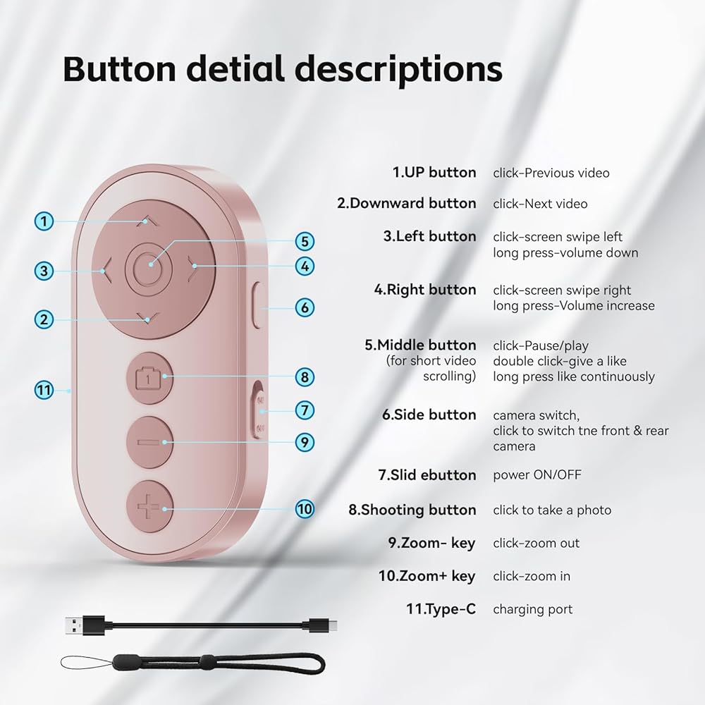 【Zoom in and out】This is smartphone camera remote design with zoon in & out function control. With the plus or minus keys, you can freely adjust the focal length of your phone's camera. Long press the zoom +/- keys to steplessly zoom, ensuring a smooth zooming experience. Noted: Front camera do not have zoom function. Note:Do not work with iPad or any kinds pad