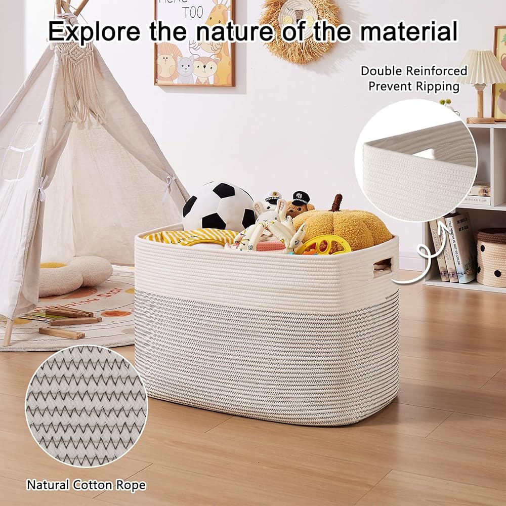 100% Cotton Rope Storage Basket:OIAHOMY woven baskets are made of 100% natural cotton, chemical and odor free, there are no sharp or hard edges to scratch floors, and safe for kids and pets. It is more firm than plastic basket