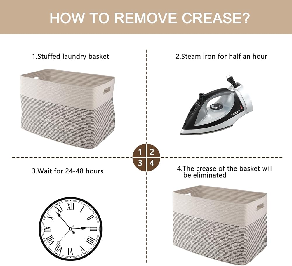 Washable Big Basket: This shoes basket can be washed by hand or machine with gentle detergent. If machine washed, please put them into a laundry bag. NOTE: These cotton rope baskets are folded when shipping, but it will turn back to its elegant shape quickly if you fill it with some towels or clothing, and iron is great idea to remove the creases