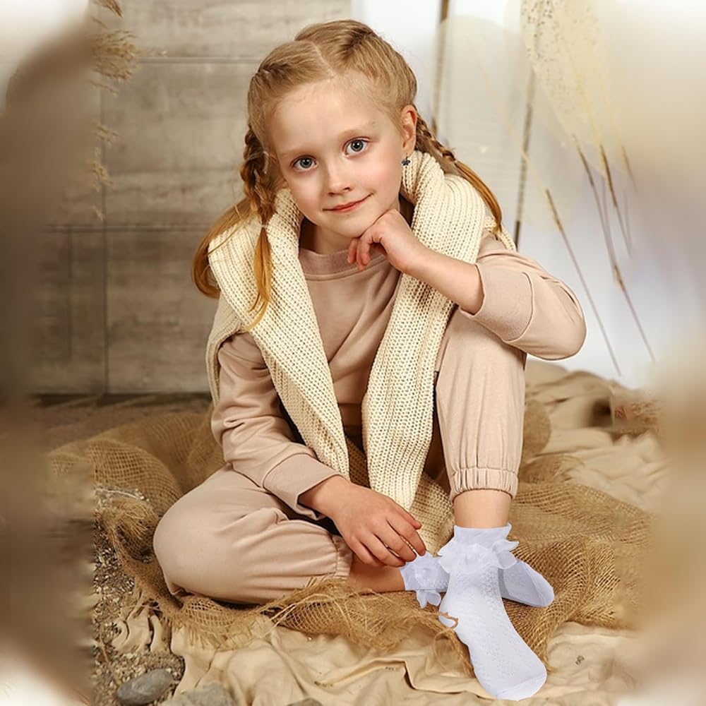 【Easy to Match】1 pairs of White lace ruffle socks,to provide you with more choices to wear, Cute frilly socks for girls are great for matching your dresses,princess skirts,jackets and pants. Girls ruffled socks lace can also be matched with various boots and shoes as chic accessories for daily wear or for various parties and dates. A perfect holiday gift for kids,girls and children.