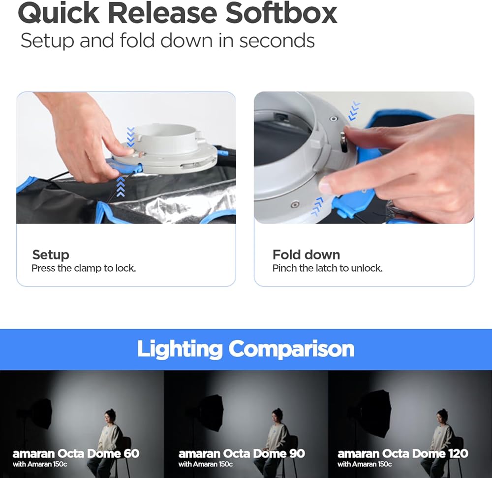 【Quick-Folding Design for Quick Setups】By simply pushing down on the speed ring handle to lock, the amaran Octa Dome 90 can snap into its octagonal shape in seconds, making it faster and easier than ever to build and break down your softbox. Say goodbye to cumbersome gear so you can focus on bringing your creative ideas to life.