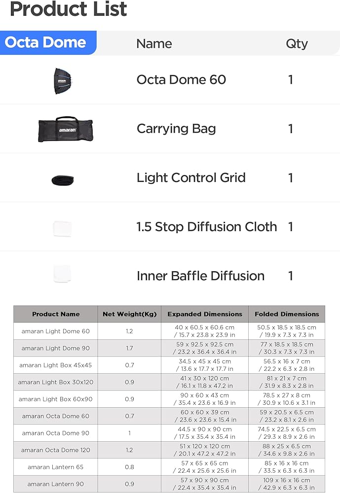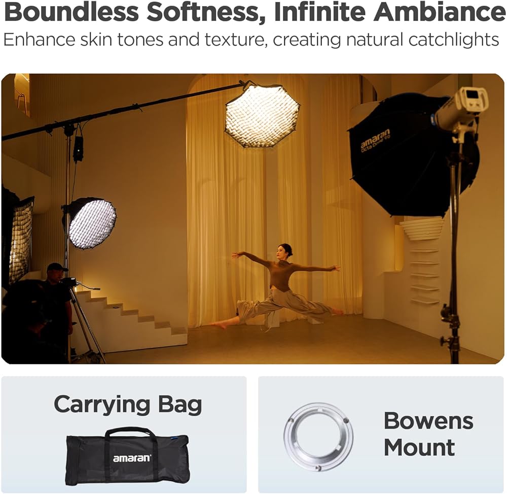 【Your Creative Toolkit, All in One Bag】The amaran Octa Dome 90 comes with all the components you need, packed in a carrying bag. Create a natural glow on your subjects with the included diffusion or add depth with the included control grid. With a fast and seamless experience from setup to shoot, this softbox is the perfect companion for any creation.