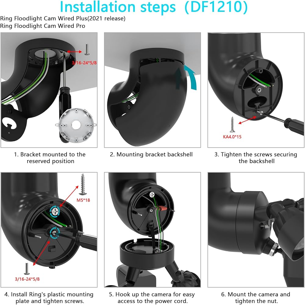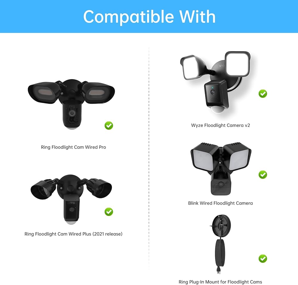 Compatible Models: This eave mount is tailor-made for the Ring Floodlight Cam Wired Plus/Pro, Roku Floodlight Camera, Ring Smart Lighting Floodlight Wired, Blink Wired Floodlight Camera, Wyze Floodlight Camera v2/ProRing Floodlight Cam Wired Plus/Pro, Roku Floodlight Camera, Ring Smart Lighting Floodlight Wired, Blink Wired Floodlight Camera, Wyze Floodlight Camera v2/Pro, ensuring a precise fit for both devices.