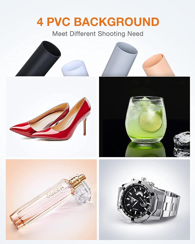 4 Color Backdrop:White/Gray/Orange/Black backdrops are made of thicker PVC, which are durable and anti-wrinkles, easy to change and clean