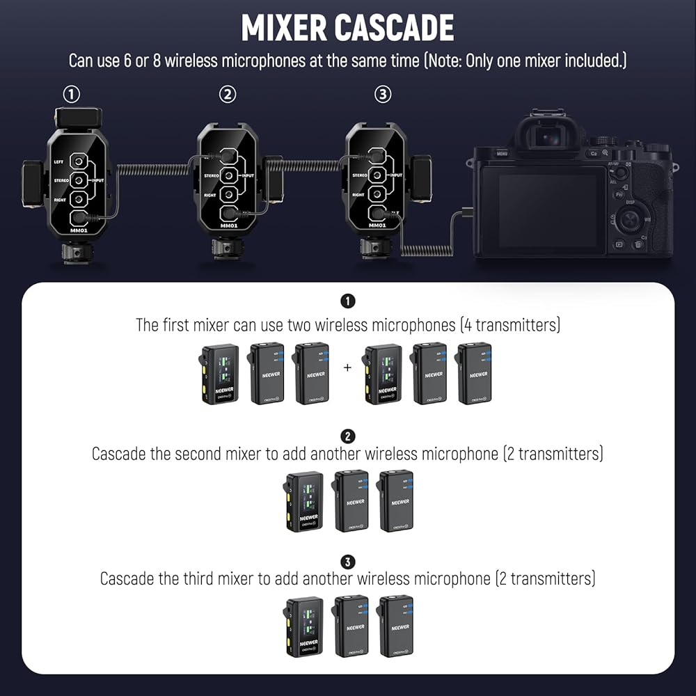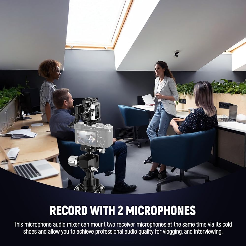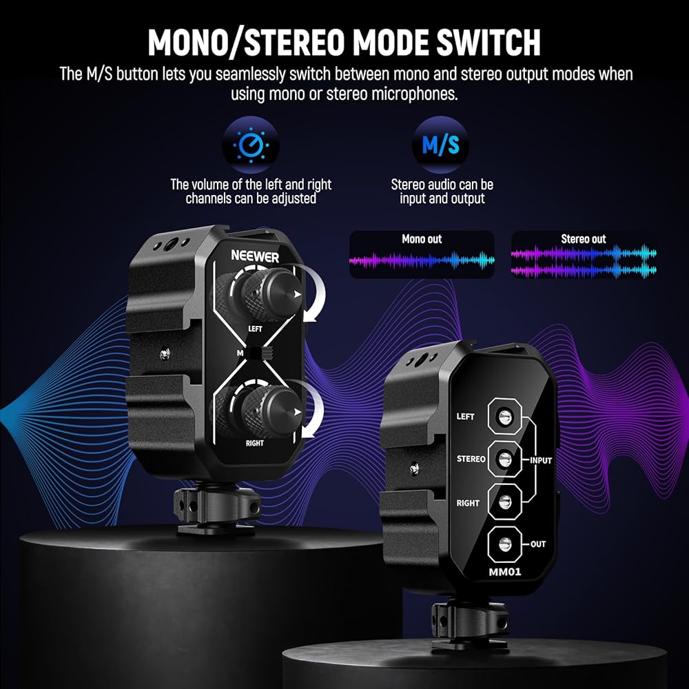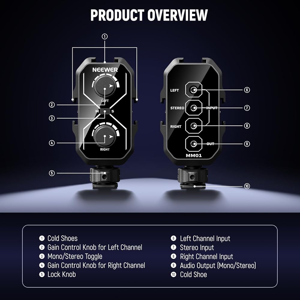 【Cold Shoes & 1/4" Threads】 Attach the mixer to your camera via a cold shoe adapter and secure with the thumb wheel. The three additional cold shoe brackets allow mounting of wireless receivers (NEEWER CM31, CM28, CM28 PRO, and more) or LED lights (NEEWER PL81, RGB62). 1/4" threads can connect magic arms and other small photography videography gear or accessories as content creator essential and influencer must have
