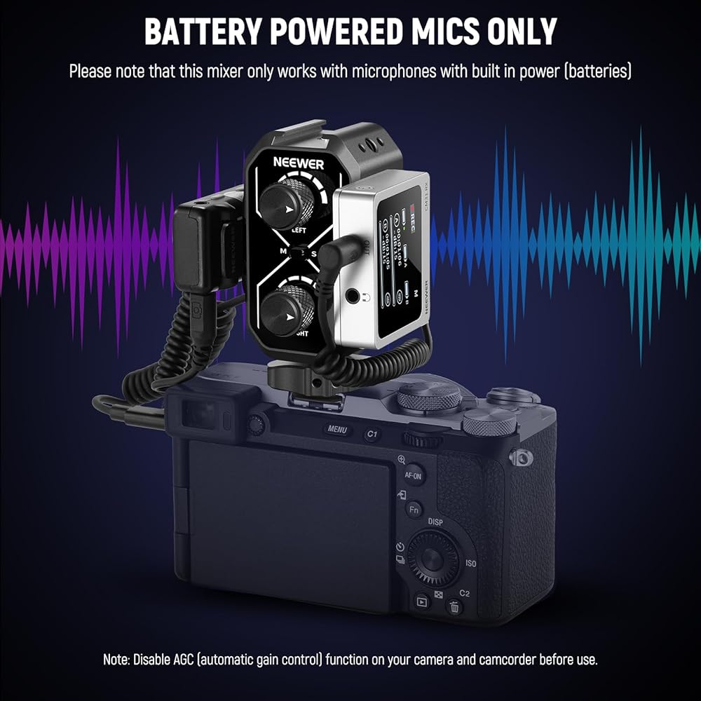 【Battery Powered Mics Only】 An ideal solution for mounting two compact microphones and sound mixing, this mixer lets you effortlessly mount and control two microphones or wireless receivers. Since it does not require batteries or external power supplies, it only works with battery powered microphones