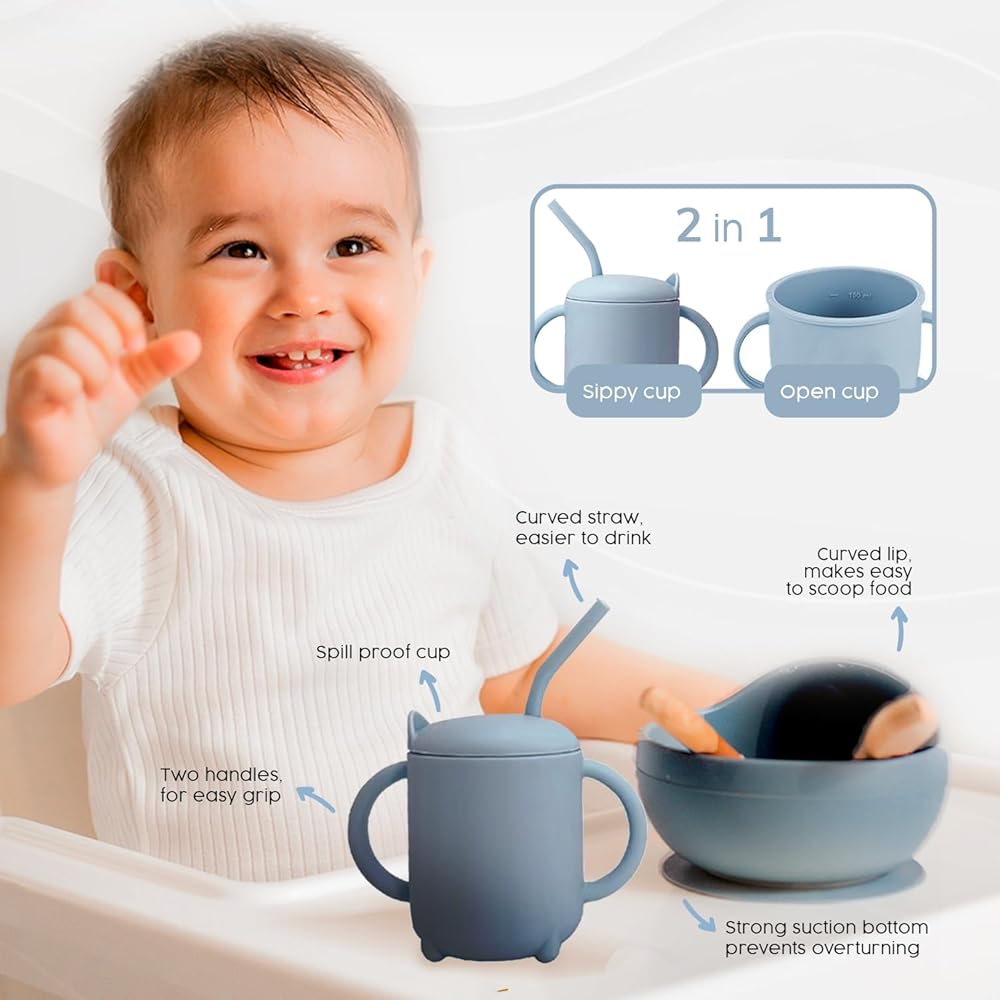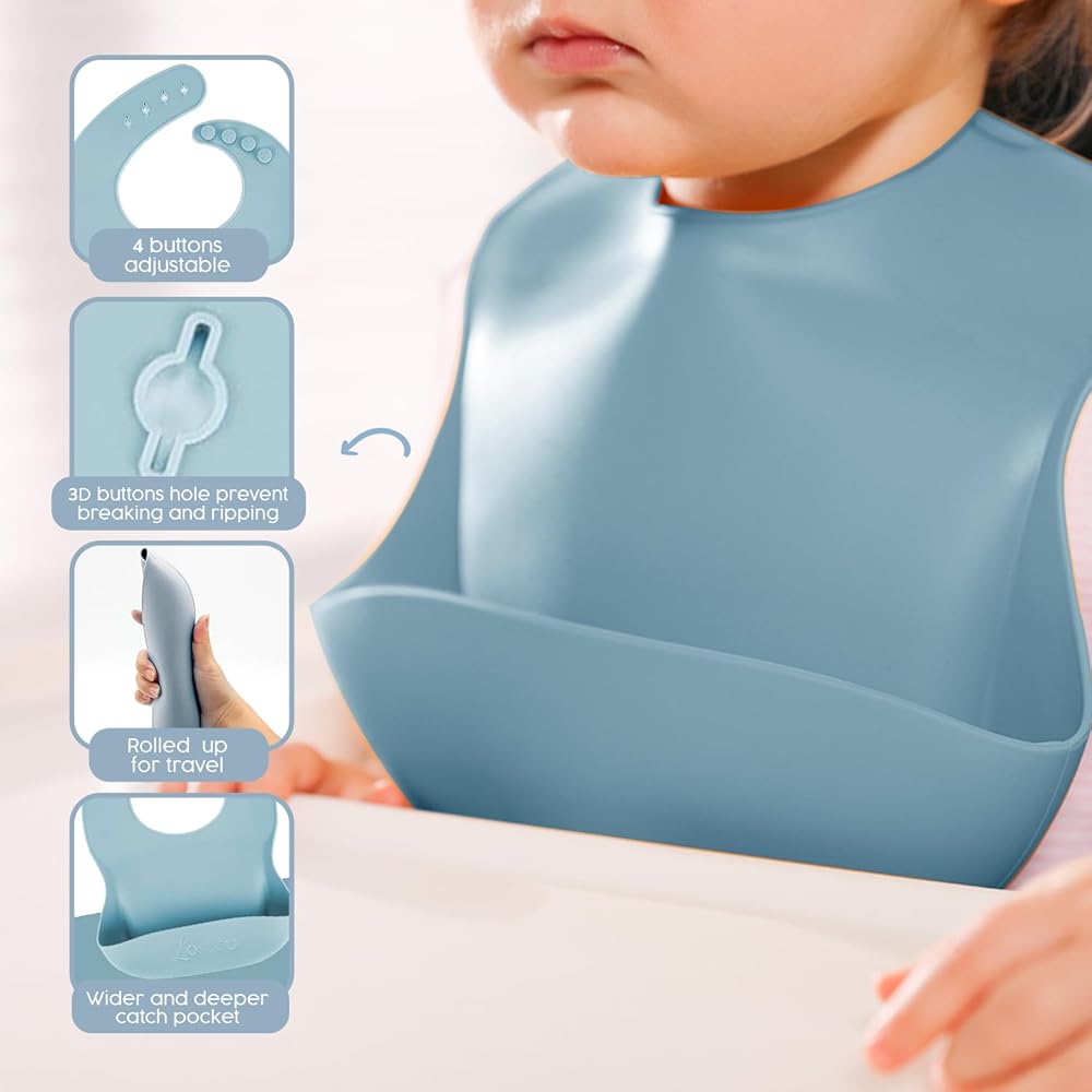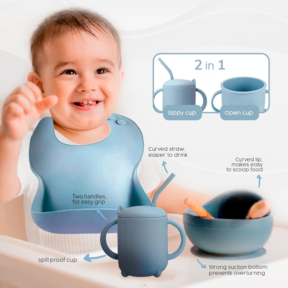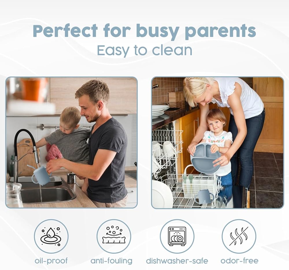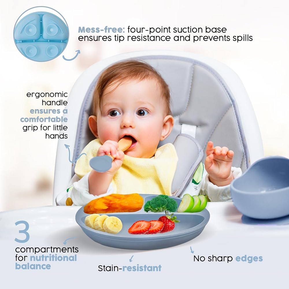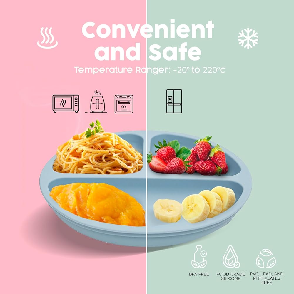 DURABLE, EASY-CARE DESIGN - The Silicone Baby Feeding Set is not only dishwasher, oven, and freezer safe, but it also resists absorbing flavors and smells and is resistant to oil stains. Its durable design ensures it won't rip or break during use, making it a lasting addition to your baby's mealtime essentials.