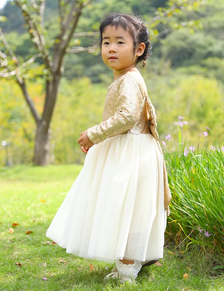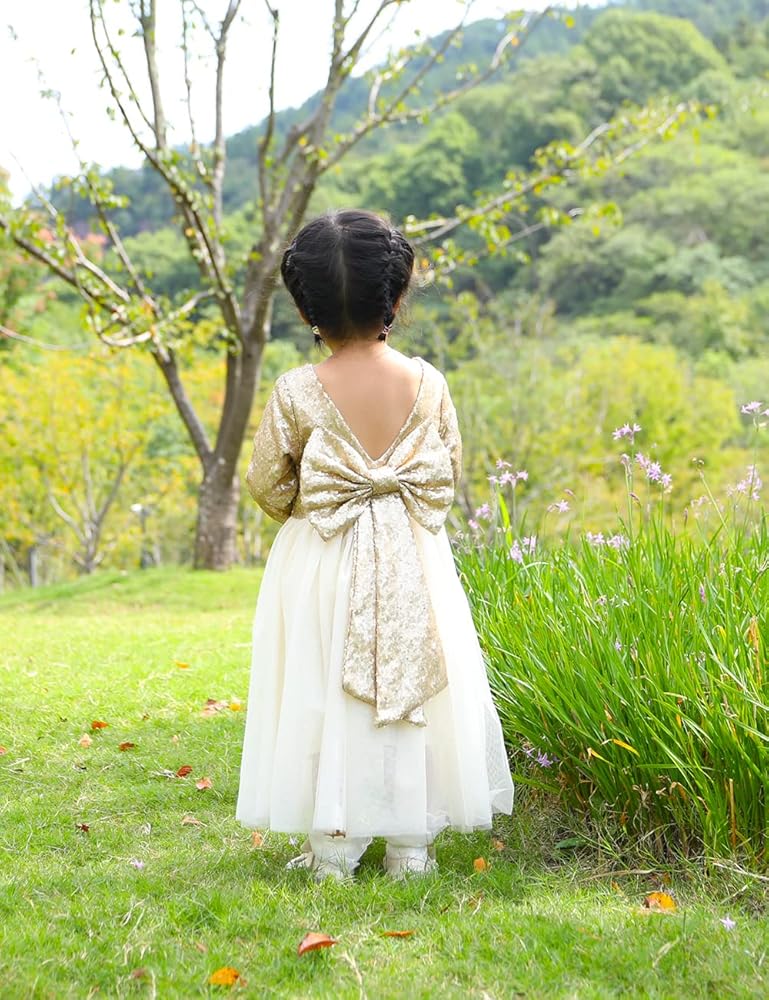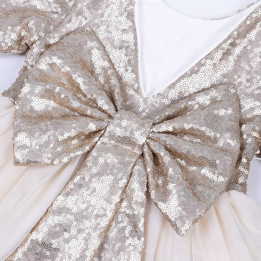 ELEGANT TODDLER GIRLS TULLE DRESS:Cilucu brand flower sequin girls open back long sleeve dress with big sparkle bow back and maxi tutu bottom.These new style sequin dress for kids are sure to make your girls day bright and sparkle.