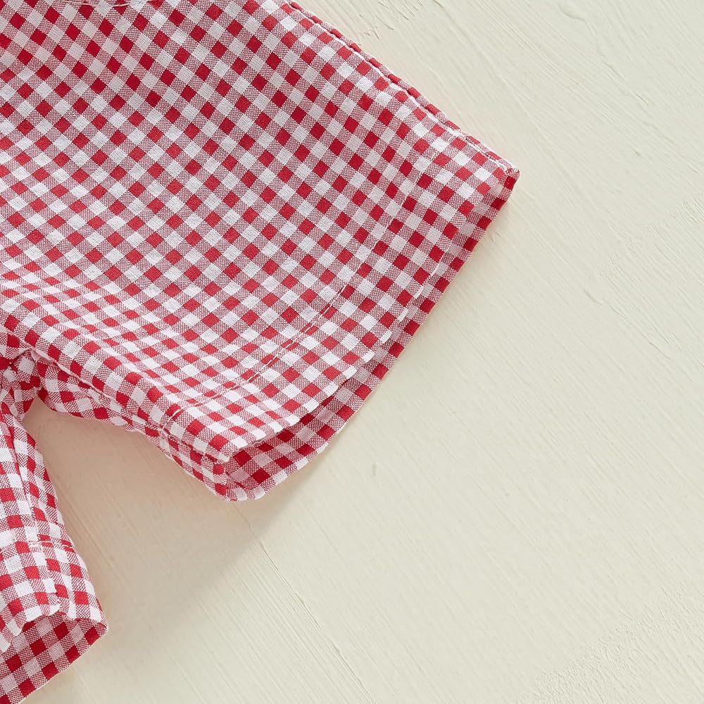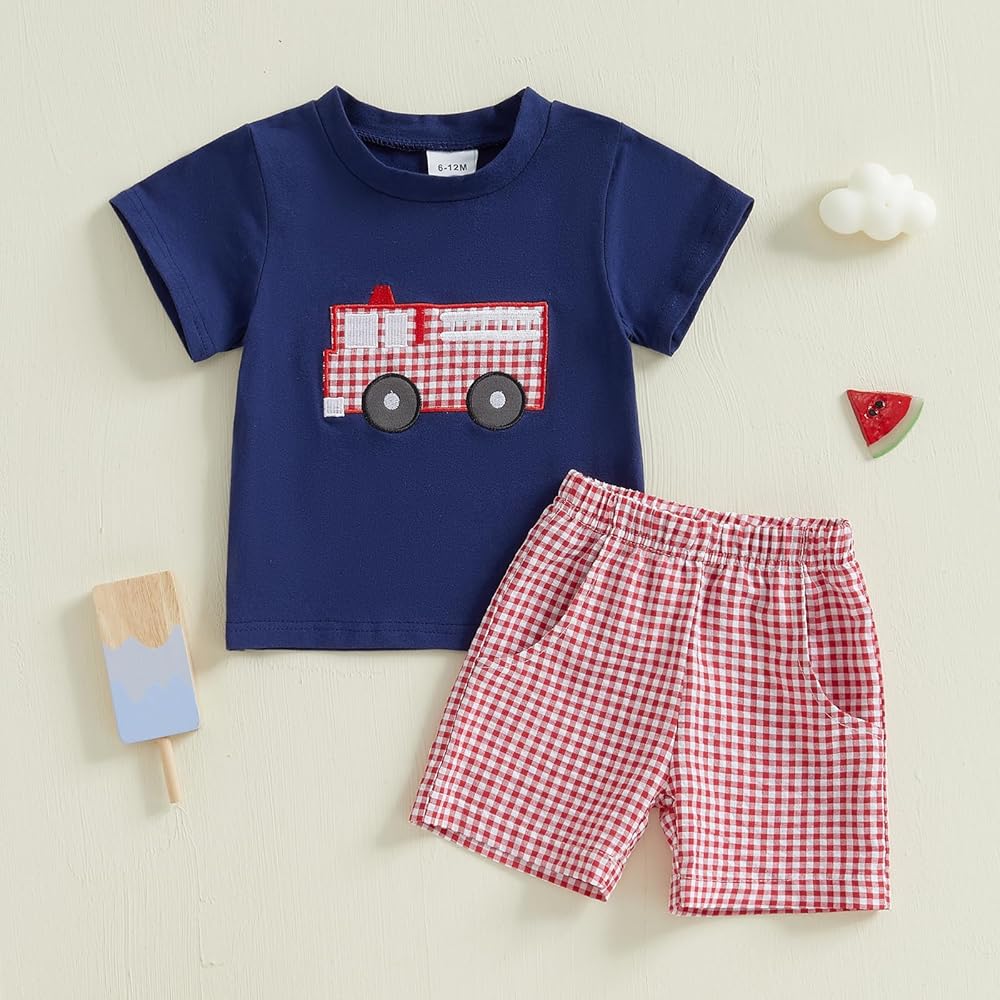 Design:Newborn boy outfits, little boy's clothes, baby boy cloths; Loose fit; Tops with short sleeve, round neck, fire truck embroidery; Shorts with elastic waistband, plaid print, side pockets, baby boys' clothing sets, casual style