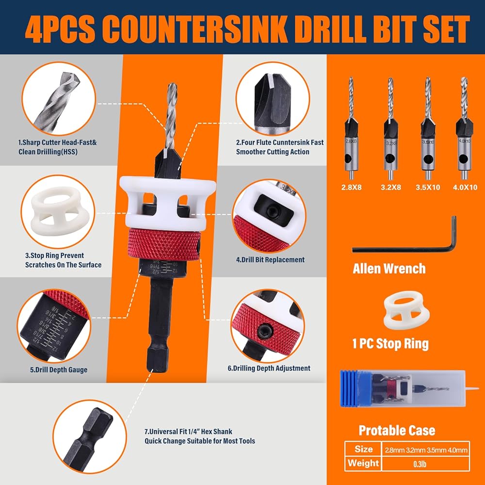 【Set Includes】Our premium 4-piece Countersink Drill Bit Set features M2 HSS tapered pilot drill bits in sizes 2.8MM×8MM, 3.2MM×8MM, 3.2MM×10MM, 4.0MM×10MM,