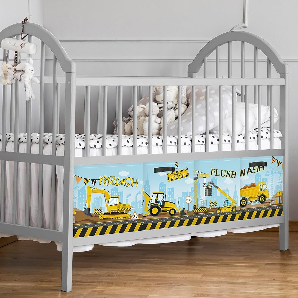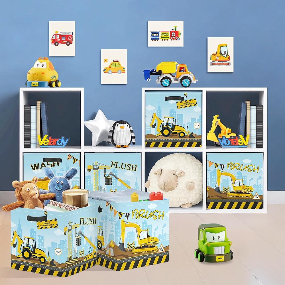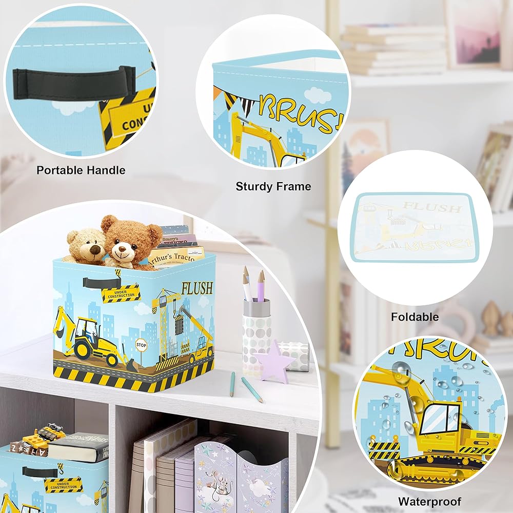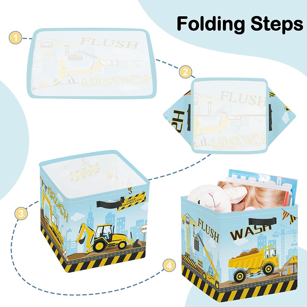 Construction Vehicles Cube Storage Organizer: Printed with “WASH”, “BRUSH”, “FLUSH”, with cartoon excavators, dump trucks, cranes and other construction vehicles and traffic signs, rich in children's fun. Suitable for children