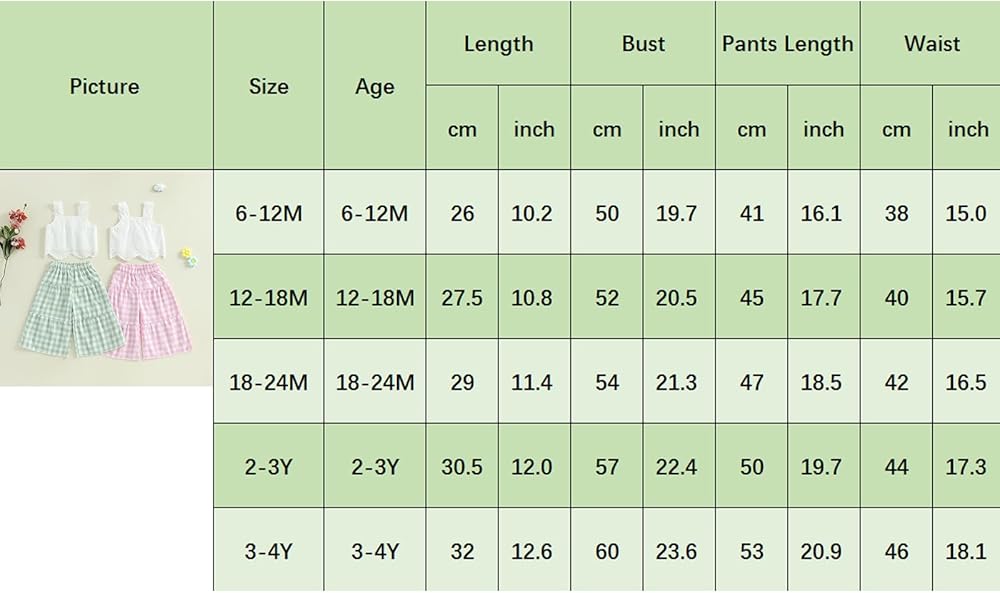 6-12M Tops Length: 10.24 Bust: 19.69 Waist: 14.96 Pants Length: 16.14 Advised Age: 6-12 Months