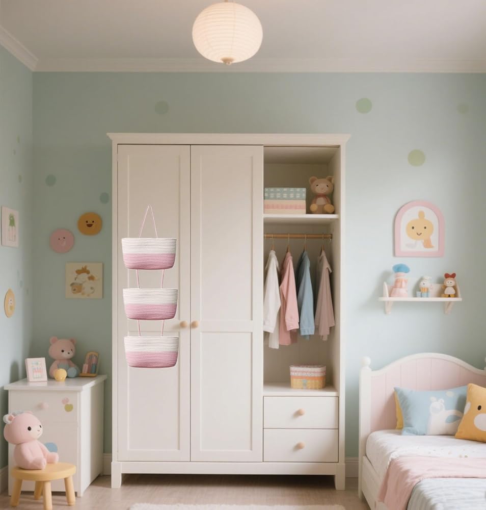 WASHABLE& FOLDING: Rope hanging baskets can be washed with mild detergent by washing machine, just put it in a laundry bag in your washing machine, and it will keep its shape and have no abrasion. Nursery wall hanging baskets for storage can be folded and stored when not in use, not occupying space. Filled with towels or blankets or ironed to recover its original shape.