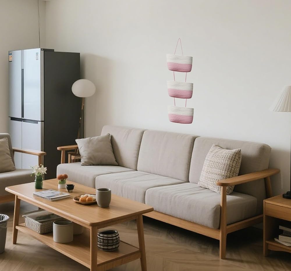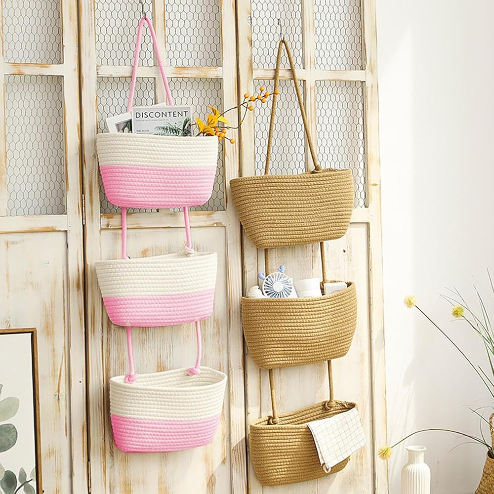 LARGE CAPACITY: The whole woven cotton hanging wall basket measures a total height of 44.5 inches, with each basket-top length: of 14.4 inches; bottom length: of 12 inches; height: of 7.8 inches; and bottom width: of 2.75 inches; 1 over-the-door hook and 4 sticky hooks are prepared for you to hang up the basket.