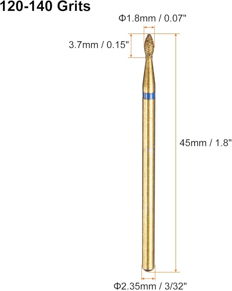 Size - Grits: 100-120 Grits; Diameter: 2.2mm / 0.09"; Head Length: 9mm / 0.35"; Shank Diameter: 2.35mm / 3/32"; Shank Length: 36mm / 1.42"; Total Length: 45mm / 1.8"; The multi-purpose tool diamond drill bit set is packaged in a sturdy plastic box for your convenience to carry and store