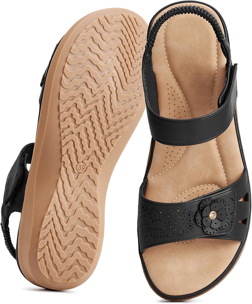 Design: Sandals for women 2025 with adjustable hook and loop strap at instep, ideal for sensitive feet and bunion feet. Womens sandals black with reasonable foot structure support design, ideal for long-term wear and enhance your walking experience